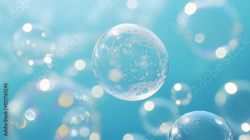 Soap bubbles and foam on ocean blue background. Macro photography of white foam texture and transparent suds. Clean minimalist design with aqua blue gradient. Hygiene concept in commercial style.