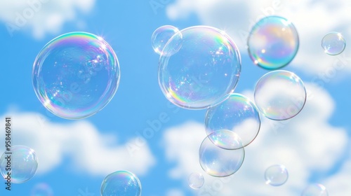 Soap Bubbles Floating Gracefully Against a Bright Blue Sky with Fluffy Clouds