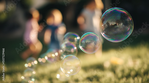 soap bubbles floating in a sunny park, perfect for children's activities, leisure concepts, or summer lifestyle designs