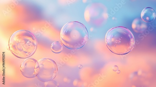 Soap bubbles floating in colorful sky at sunset, dreamy atmosphere. Abstract concept
