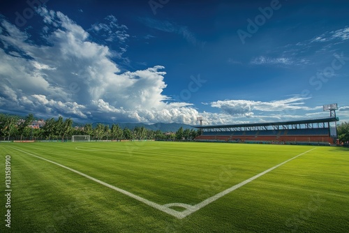 Soccer field with a cloudy sky in the background, ideal for sports or weather related concepts