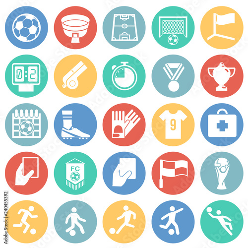 Soccer icons set on color cirles background for graphic and web design, Modern simple vector sign. Internet concept. Trendy symbol for website design web button or mobile app