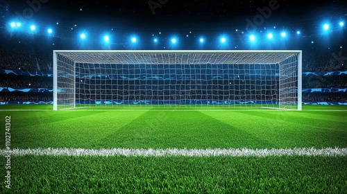 Soccer Stadium Scene with Goalpost and Cheering Fans in Bright Lights