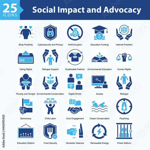 Social Impact & Advocacy is a collection of icons in sheet format illustrating global social issues, human rights movements, and sustainability campaigns supporting positive societal change.