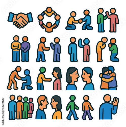 Social interaction icon collection. communication, handshake, group, talk, hug, linear
