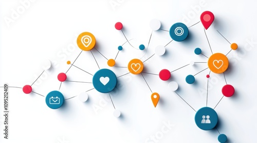 Social Media and Sharing Location Icons A map with location pins and social media icons, representing check ins and location based social networking.