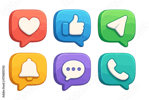 Social media icons 3D render style. Like, comment, share, notification bell, call, message. Cute cartoon communication symbol set for app, web UI. Modern glossy button collection.