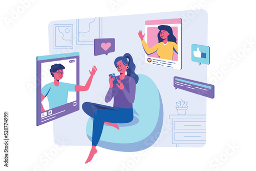 Social network concept with people scene for web. Woman surfing webpages and online blogs, scrolling feeds, likes and comments posts with friends photo. Vector illustration in flat perspective design