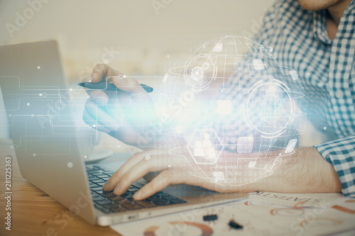 Social network theme hologram with businessman working on computer on background. Concept of world wide web. Double exposure.