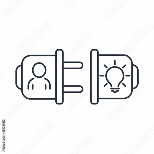 Socket and plug. Man and idea. Efficient connection. Vector linear icon isolated on white background.