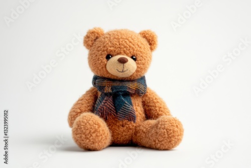Soft and cuddly teddy bear carefully posed against a serene white background with a stylish scarf isolated on transparent background