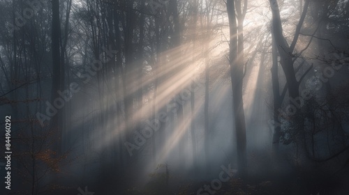 Soft beams of light filter through the mist creating a ethereal atmosphere and revealing glimpses of hidden beauty. .