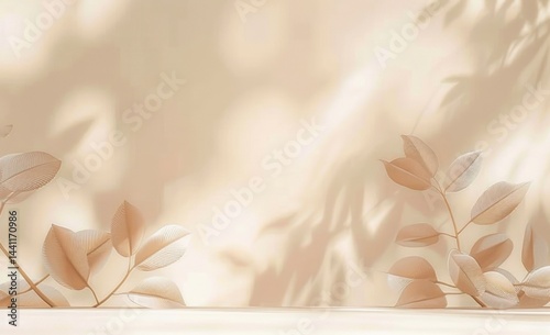 Soft beige background with delicate translucent leaves casting gentle shadows, creating a calm and serene atmosphere