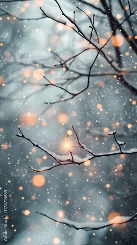 Soft blurred bokeh lights twinkling gently above a quiet forest road covered in snow evoking a tranquil seasonal holiday ambiance