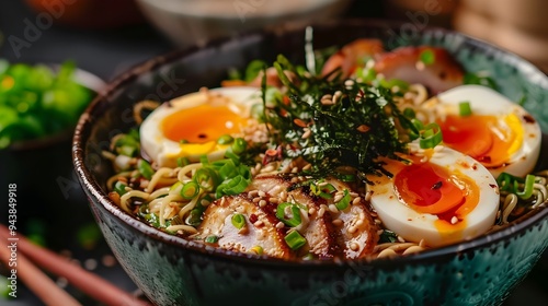 Soft Boiled Egg Spilling Into Savory Ramen Bowl with Asian Fusion Toppings