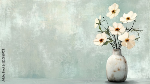 Soft Color Floral Arrangement in Rustic Vase on Minimal Background