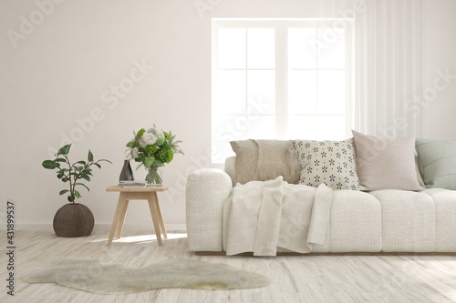 Soft color living room with sofa. Scandinavian interior design. 3D illustration