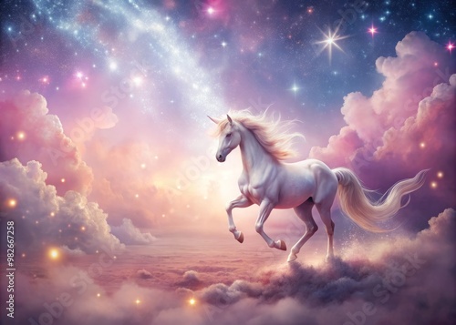 Soft focus fantasy scene with a delicate unicorn prancing across a breathtakingly beautiful pink-hued sky adorned with twinkling stars and an iridescent glow that adds an air of whimsy and romance