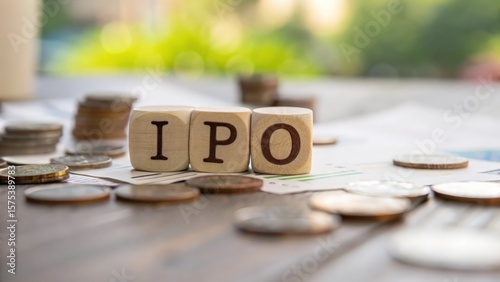 Soft focus minimalist scene with wooden letter blocks forming IPO investment word