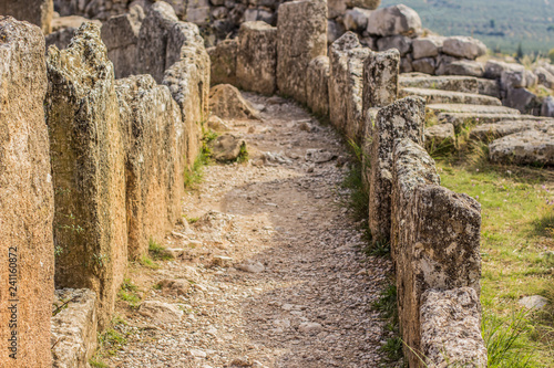 soft focus stone ruins corridor path way between small narrow walls, abandoned ancient antique city world heritage touristic site