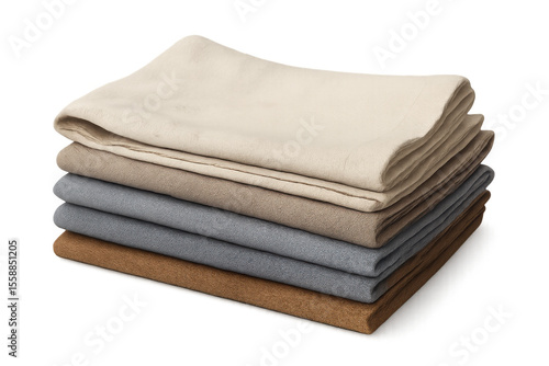 Soft folded blankets in neutral tones, stacked neatly and creating inviting texture against transparent backdrop