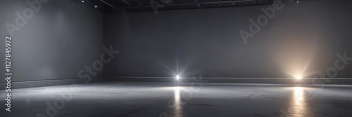 Soft gray background with three faint light sources illuminating the space , quiet ambiance, minimalist decor