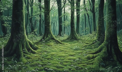 Soft green moss blankets the forest floor amidst towering trees, serene landscape, forest