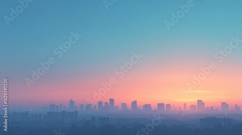 Soft hues blend in sky as city skyline emerges through gentle mi