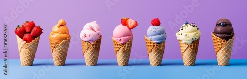 Soft ice cream in a waffle cone with fruits and berries, different colors and fillings. Delicious cold dessert. Neon light minimalistic background. Generative AI