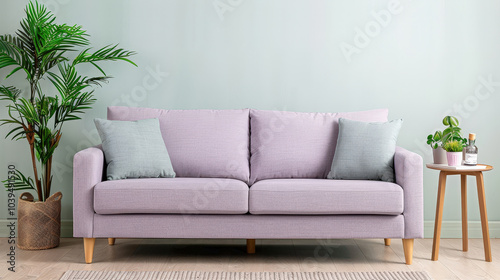 soft lavender sofa with blue cushions creates cozy atmosphere in stylish living room. surrounding plants add touch of nature, enhancing serene vibe
