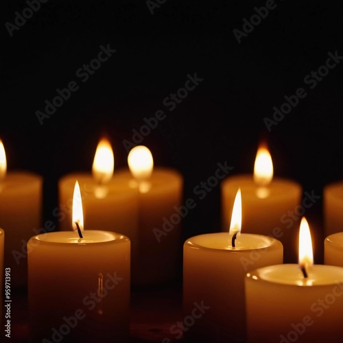 Soft light from flickering candles illuminates tranquil scene, inviting calming ambiance. Expression of regret, eternal memory and mourning. Religious ritual cult. Moments of reflection serenity. AI