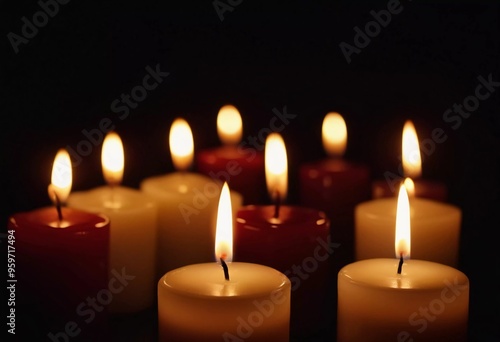 Soft light from flickering candles illuminates tranquil scene, inviting calming ambiance. Expression of regret, eternal memory and mourning. Religious ritual cult. Moments of reflection serenity. AI