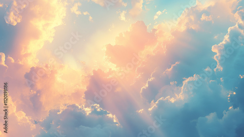 Soft pastel clouds with sun rays at sunrise