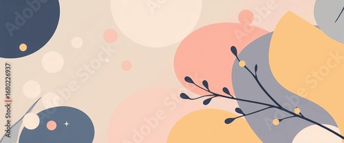 Soft pastel earth tones, organic shapes, dots, curves, leaf branch pattern , muted, modern