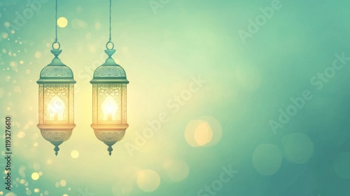 Soft Pastel Green Background with Glowing Lanterns Hanging Down