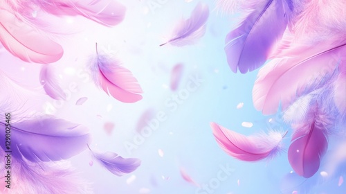 Soft Pink and Purple Feathers Floating on a Light Blue Background Dreamy Pastel Colors Ethereal and Delicate Texture Airy and Gentle Atmosphere