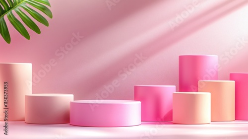 Soft Pink Background with Simple Geometric Shapes and Green Leaf
