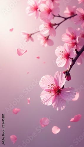 Soft pink sakura petals float gently in the air, creating a delicate pattern against a serene background, gentle, flowers