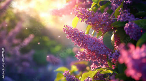 Soft sunlight filters through vibrant purple lilac blossoms, creating a peaceful atmosphere in a blooming garden during the spring season, inviting tranquility.