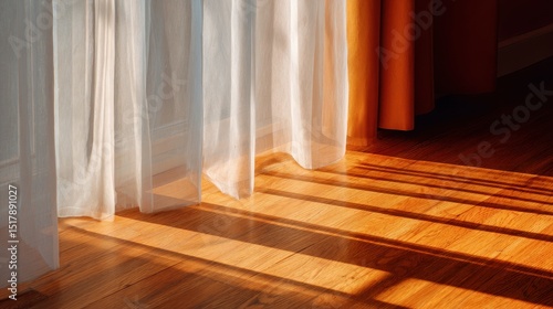 Soft sunlight streaming through sheer curtains, casting warm shadows on a wooden floor