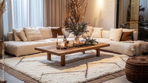 Soft textiles and warm lighting create a serene atmosphere in this Scandinavian living room. Natural decor elements enhance the comfort, inviting relaxation and leisure