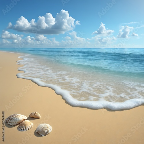Soft waves gently lap the sandy beach under a bright sky.