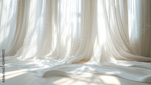 Soft white curtains gently swaying in sunlight create a serene atmosphere in a spacious room
