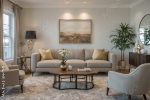 Soft-focus backdrop of a modern lounge area with a plush gray couch, stylish decorative pieces, and a welcoming ambiance ideal for family time.