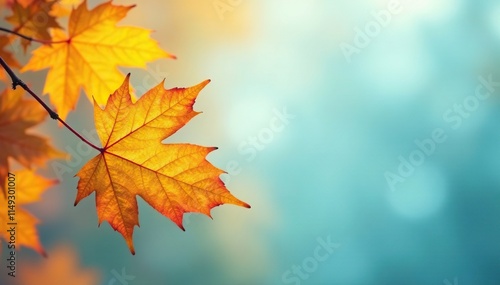 Softly fading golden leaves on a pale blue background, soft focus, autumn leaves