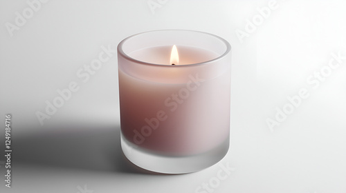 Softly glowing candle in a frosted glass holder. Adds warmth and ambiance to a minimalist setting with neutral tones.