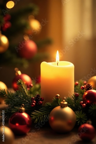 Softly glowing candle on a golden advent background amidst Christmas ornaments, , golden, calm