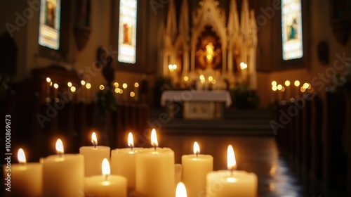 Softly glowing candles in the foreground with a majestic church altar in the background, creating a serene atmosphere.