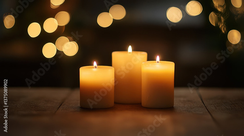 Softly Glowing Candles on Wooden Table with Warm Bokeh Lights