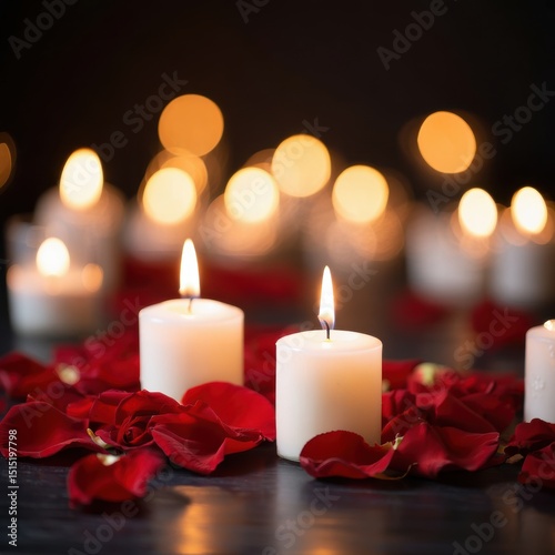 Softly glowing candles surrounded by scattered red rose petals, creating a romantic and serene atmosphere.